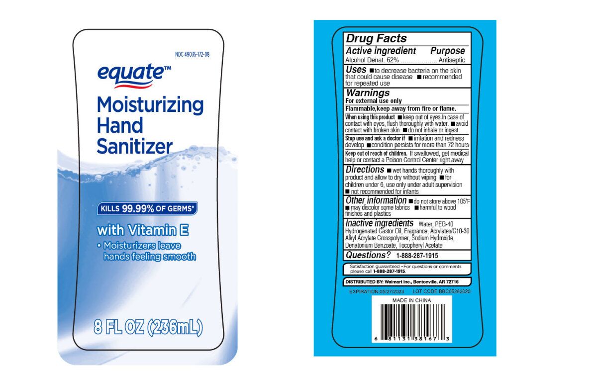 This is a drug facts label of a moisturizing hand sanitizer that contains 62% of Alcohol Denat and has a volume of 286ml. It is used to decrease bacteria on the skin and may cause irritation or redness if used persistently for more than 72 hours. The product should be kept out of reach of children and is not recommended for infants. It contains inactive ingredients such as PEG-40, Frarance, Acnates/C10.30, ur Hydoxide, and Soy Aceate. It is distributed by Wal-Mart INC and is manufactured in China. Contact 1-833-267-115 for questions.*