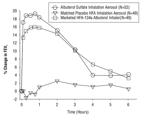 This text provides information on the % Change in FEV (Forced Expiratory Volume) for three different groups over time in hours: Albuterol Sulfate Inhalation Aerosol group (N=52), Matched Placebo HFA Inhalation Aerosol group (N=49), and Marketed HFA-134a Albuterol Inhaler group (N=49).*