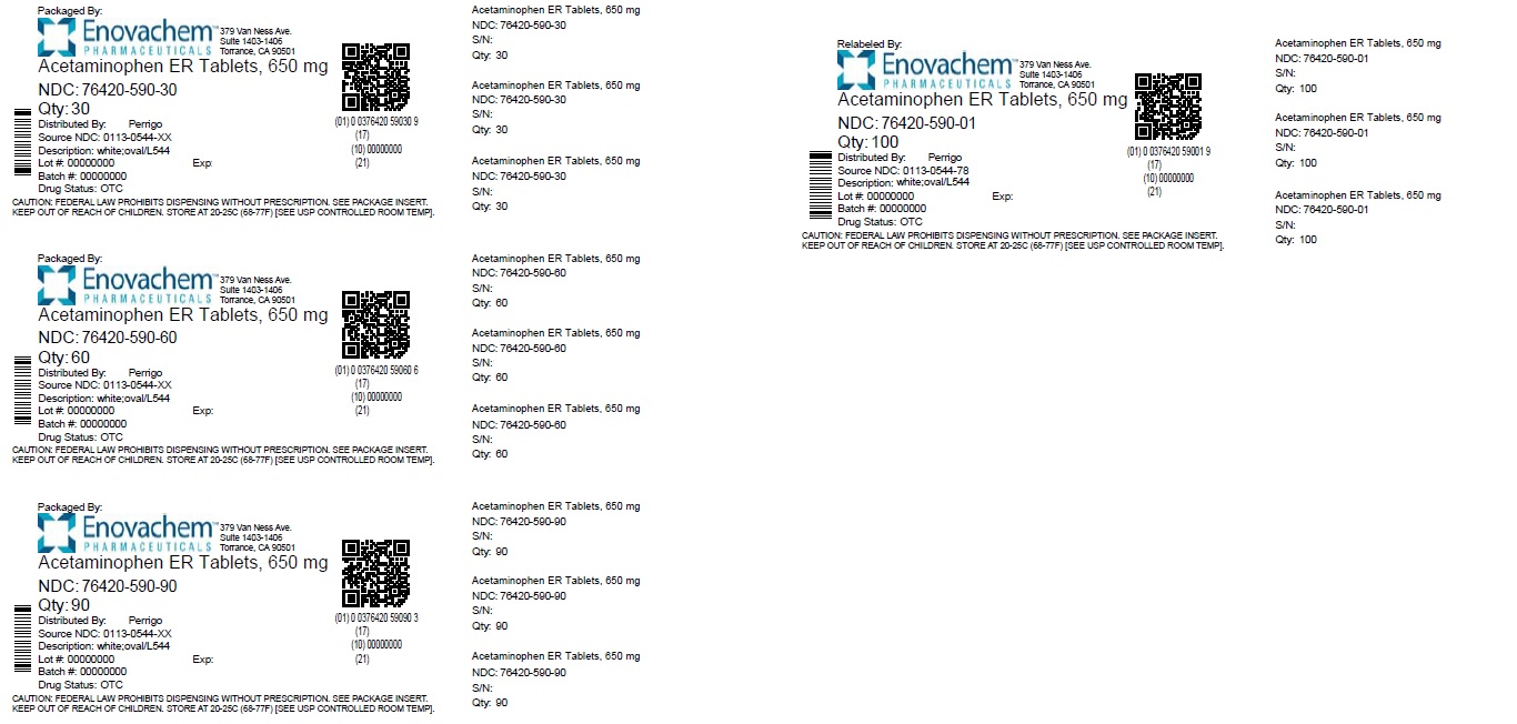 This text provides information about various packages of Acetaminophen ER Tablets with a dosage of 650mg, 850mg, and 1050mg. Each package has different quantities ranging from 30 to 100 tablets. The tablets are for over-the-counter use and should be stored at temperatures of 20-250°C (55.77°F). The text also includes NDC numbers for identification purposes.*