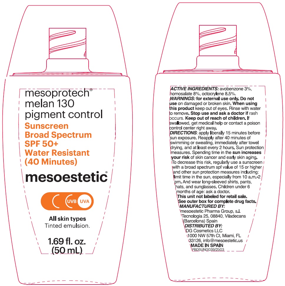 This is a description for a sunscreen product called "melan 130 Pigment Control" with SPF 50+. The sunscreen is a tinted emulsion suitable for all skin types and is water-resistant for up to 40 minutes. The active ingredients include avobenzone, octisalate, and octocrylene. The directions suggest applying liberally 15 minutes before sun exposure and reapplying after swimming or sweating. It warns not to apply on damaged or broken skin and to avoid contact with eyes. The product is manufactured in Spain by mesoestetic Pharma Group and distributed in the US by DG Cosmetics LLC. For more information, refer to the outer box for complete drug facts.*