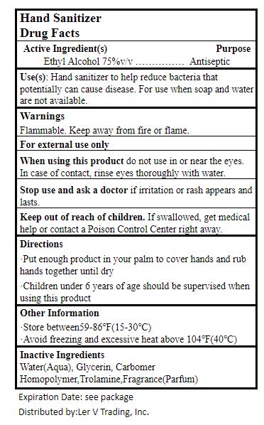 This is a drug fact description of a hand sanitizer that contains 75% Ethyl Alcohol to be used as an antiseptic when soap and water are not available. It warns to avoid contact with eyes and to supervise children under six. The product should be kept away from fire or flame and should not be exposed to excessive heat or freezing conditions. The instructions state to rub hands together until dry, and to seek medical attention if irritation or rash appears. This hand sanitizer is distributed by Ler V Trading Inc.*