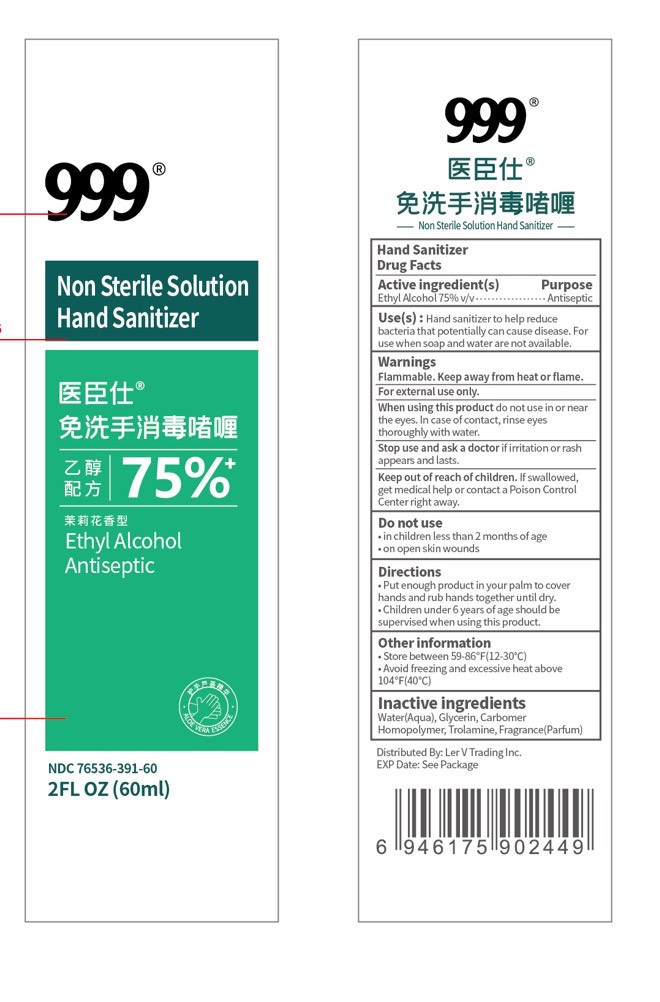 The following 2 images provide visual information about the product associated with 999 Hand Sanitizer NDC 76536-391 by Ler V Trading Inc., such as packaging, labeling, and the appearance of the drug itself. This resource could be helpful for medical professionals, pharmacists, and patients seeking to verify medication information and ensure they have the correct product.