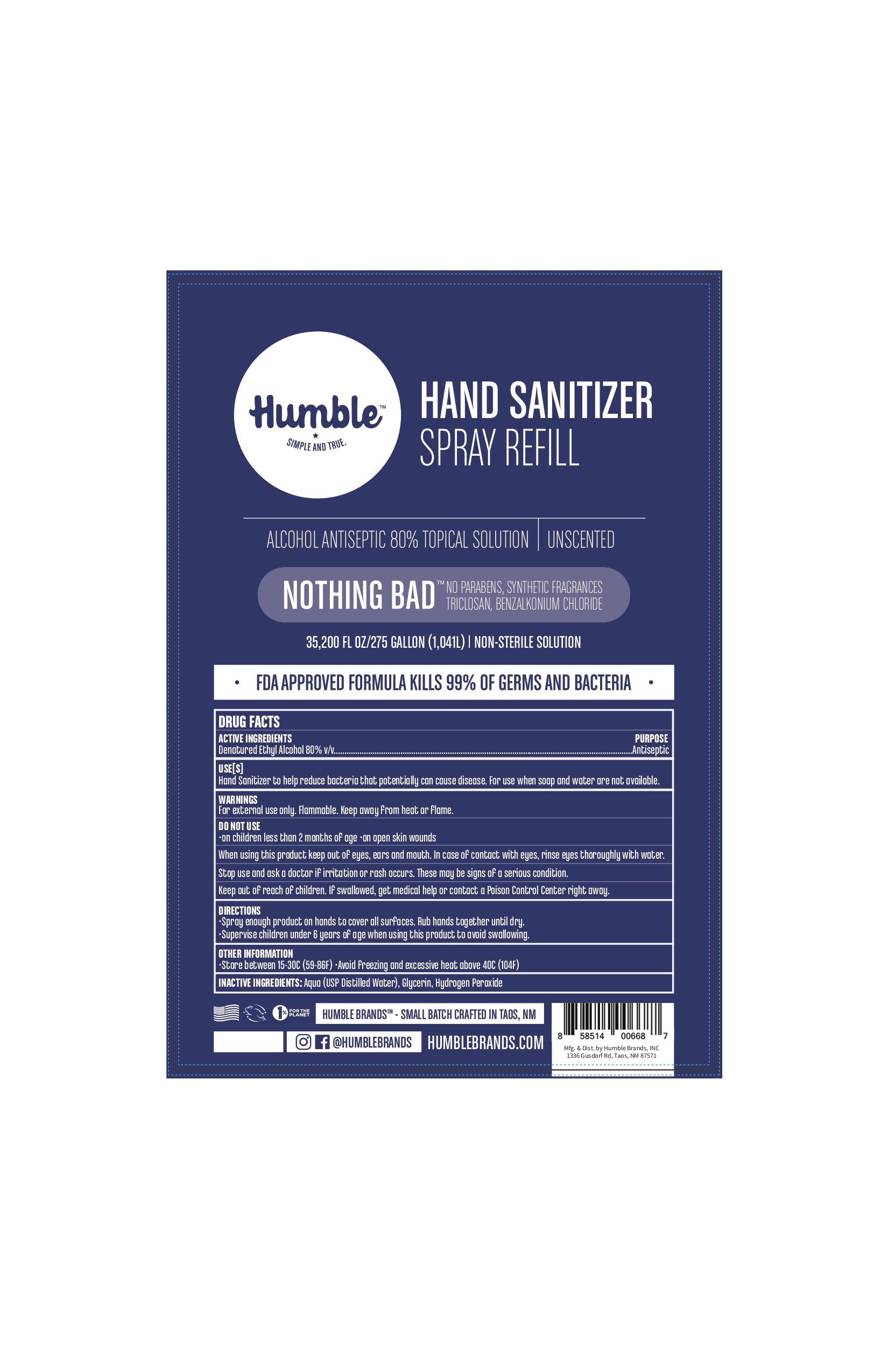 Humble Jualeiie is a 50% topical solution consisting of denatured ethyl alcohol as the active ingredient, which is FDA-approved and can kill 99% of germs and bacteria while also serving as a hand sanitizer. The solution is non-sterile and can only be used externally. The product should not be used on open skin wounds or on children under the age of two months. The user should avoid contact with eyes, ears, and mouth and immediately wash their eyes if there is any contact. It should be kept out of reach of children as it is flammable. If swallowed, medical assistance should be obtained instantly. The inactive ingredients include USP distilled water, glycerin, and hydrogen peroxide. The product is from Humble Brands and is crafted in Taos, New Mexico.*