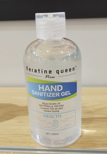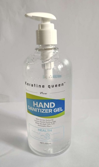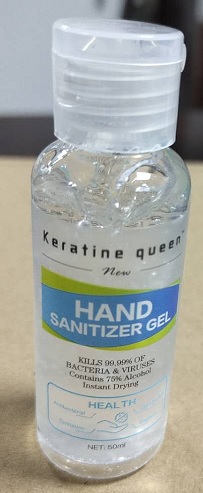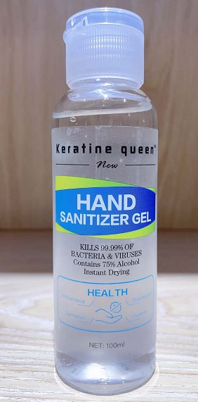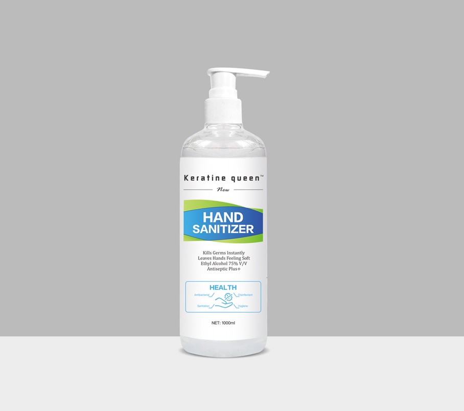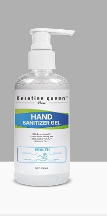 This appears to be a label for a hand sanitizer product called "Keratine Queen". It claims to instantly kill germs and leave your hands feeling soft, and contains 5% alcohol. However, some of the characters are not readable, so some information may be missing or unclear.*