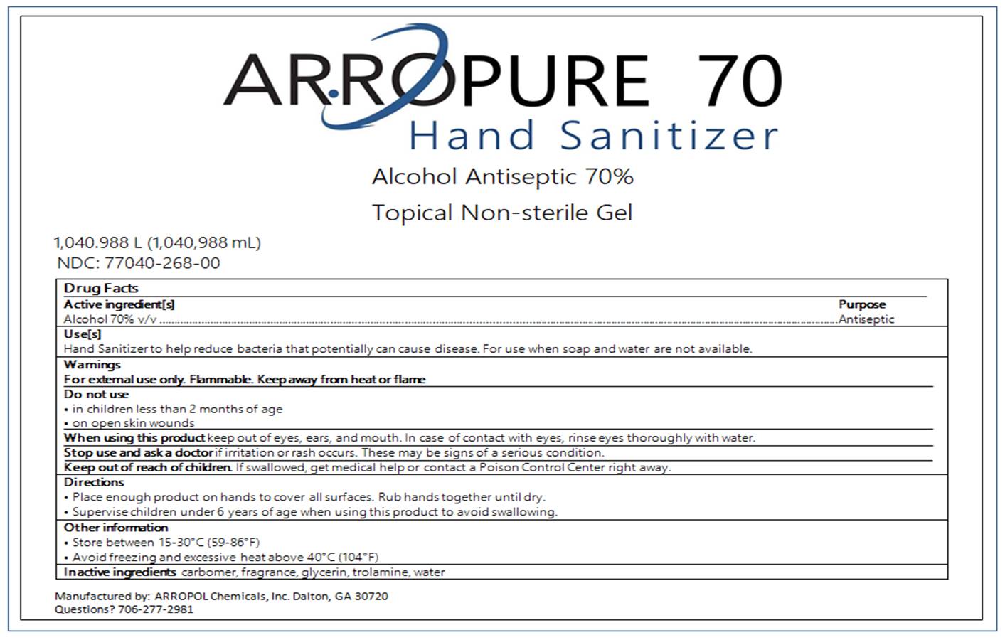 The following 8 images provide visual information about the product associated with Arropure 70 NDC 77040-268 by Arropol Chemicals, Inc., such as packaging, labeling, and the appearance of the drug itself. This resource could be helpful for medical professionals, pharmacists, and patients seeking to verify medication information and ensure they have the correct product.