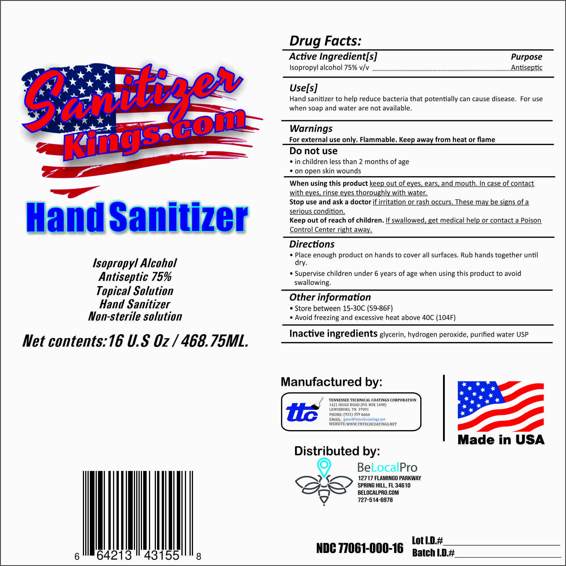 This is a 16-fl oz (468.75 mL) non-sterile hand sanitizer solution containing 75% isopropyl alcohol, designed to help reduce bacteria that can cause disease. It can be used when soap and water are not available. This product is for external use only, and it is flammable, so it should be kept away from heat or flame. The product should not be used on children less than 2 months of age, and it should not be used on open skin wounds. In case of contact with eyes, rinse eyes thoroughly with water. If irritation or rash occurs, stop use, and ask a doctor. The product is manufactured by Tennessee Technical Coatings Corporation and distributed by BelLocalPro.*