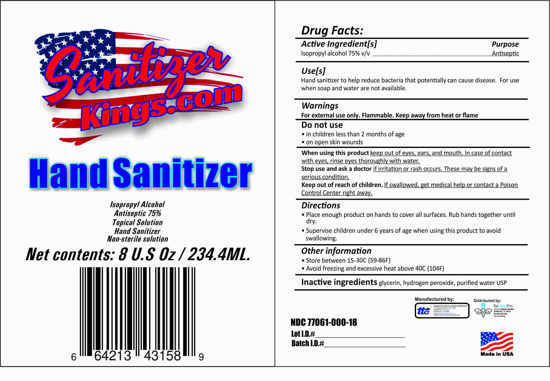 This is a 75% Isopropyl Alcohol antiseptic solution, for topical use only. It is a hand sanitizer and comes in a non-sterile solution. The net contents of the solution are 8 US oz/234.4mL. This is a useful solution to help reduce bacteria that may cause disease when soap and water are not available. This product should be kept away from heat or flame, and should not be used on children less than 2 months old or on open skin wounds. In the event of contact with eyes, rinse thoroughly with water. The product should be stored between 15-30C (59-86F) and should not be frozen or exposed to excessive heat above 40C (104F). The inactive ingredients include glycerin, hydrogen peroxide, and purified water USP. The manufacturer is not mentioned, but distributed by NDC 77061-000-08 with LotlD.# and BatchlDx_ % made in the USA.*