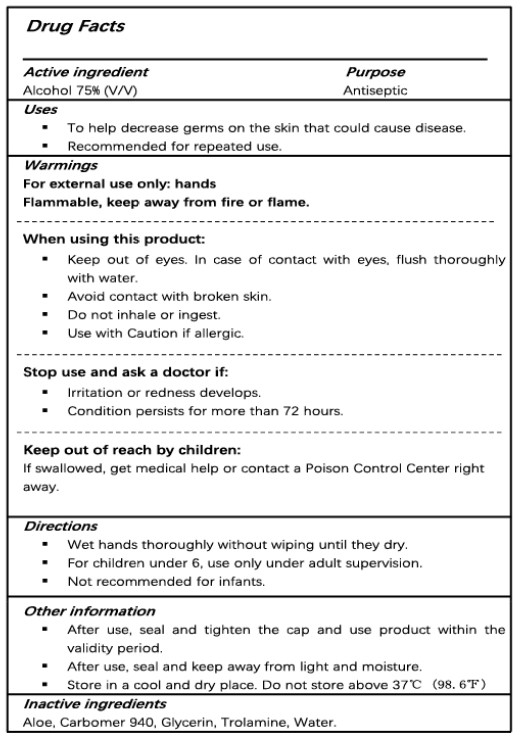 This is a description of a hand sanitizer product that contains 75% (V/V) Alcohol as an active ingredient that helps decrease germs on the skin that could cause disease. It is recommended for repeated use but should be kept away from fire or flame and out of eyes. If swallowed, medical help or contact with a poison control center is necessary. It is advised to seal and tighten the cap and use product within the validity period, and avoid storing it above 37C (98.6F). The product also contains other inactive ingredients like Aloe, Carbomer 940, Glycerin, Trolamine, and Water.*