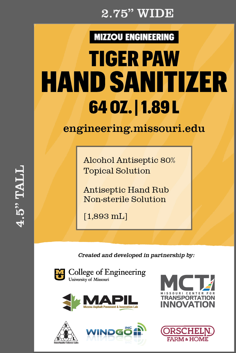 This is a description of a 2.75" wide hand sanitizer bottle with a Tiger Paw logo and text that reads "Mizzou Engineering". The sanitizer contains 1.89L (640z) of a non-sterile solution that is 80% alcohol antiseptic. The bottle was created in partnership by the College of Engineering at the University of Missouri and the Missouri Center for Transportation Innovation. Faint text near the bottom of the bottle may mention "Winds & Orscheln" Farm & Home.*