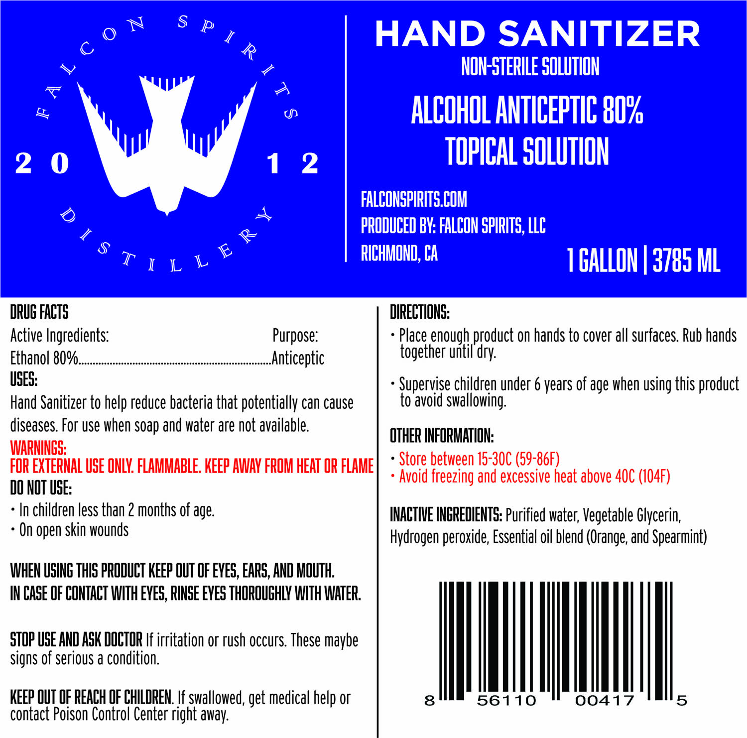 This is a description of a Hand Sanitizer solution produced by Falcon Spirits, LLC. The solution is a non-sterile alcohol antiseptic 80% topical solution that is intended mainly for external use only. The solution is capable of reducing bacteria that potentially causes diseases. The solution contains purified water, vegetable glycerin, hydrogen peroxide, and essential oil blend (orange and spearmint) as inactive ingredients. The solution comes with a warning not to use it in children less than 2 months of age or on open skin wounds. If swallowed, it is advisable to get immediate medical attention. The product should be kept out of the reach of children. The solution should be stored between 15-30C (59-86F) and should be kept away from heat or flame. The manufacturing company's website is falconspirits.com.*