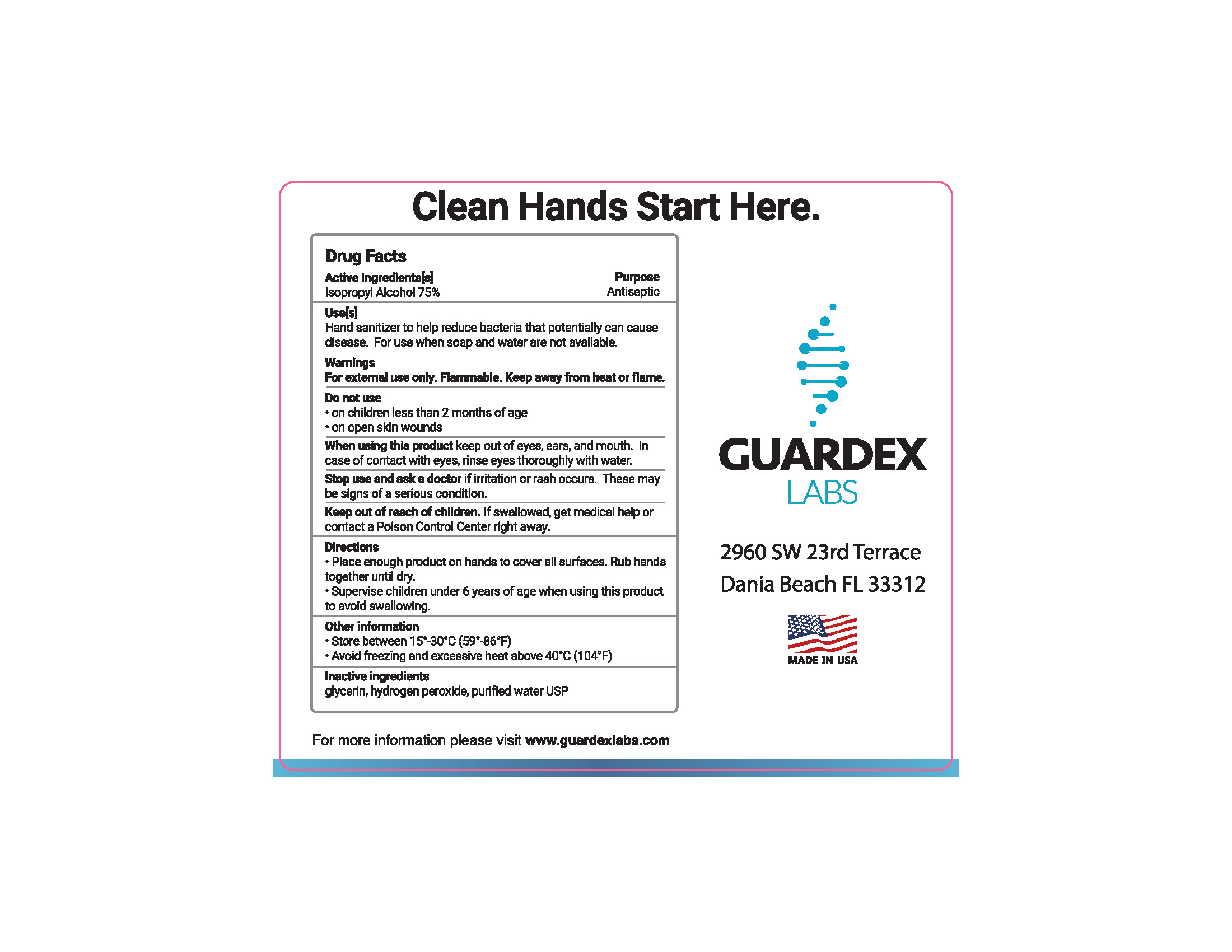This is a hand sanitizer that helps to reduce bacteria that can potentially cause diseases. It contains 75% Isopropyl Alcohol and should be used when soap and water are not available. It is only for external use and should be kept away from children's reach. One must take care to avoid contact with eyes, ears or mouth. Directions for use include placing enough product on hands to cover all surfaces and rubbing hands together until dry. The sanitizer has inactive ingredients such as glycerin, hydrogen peroxide, and purified water USP. It is made in the U.S.A. For more information about the product, visit www.guardexlabs.com.*