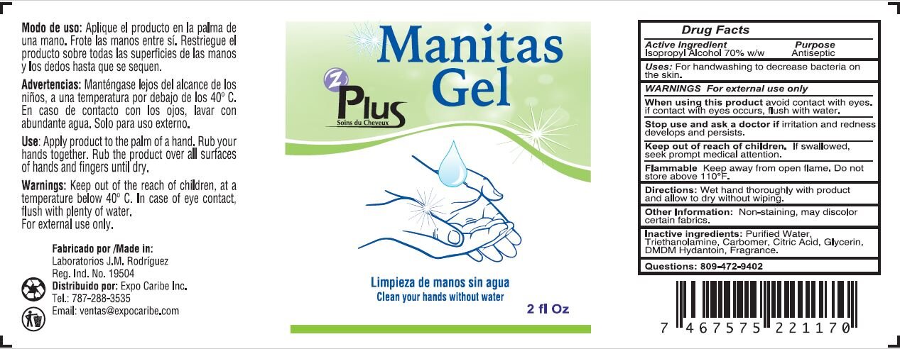 This is a drug facts label for Manitas Pus Gel, a hand sanitizer that cleanses hands without water. It contains 70% isopropyl alcohol, which acts as an antiseptic to decrease bacteria on the skin. The directions say to apply the product to the palm of one hand, Rub the hands together, and then rub the product over all surfaces of hands and fingers until it dries. The label warns to keep the product out of reach of children, avoid contact with eyes, and not use it on broken skin. The product is manufactured by Laboratorios J.M. Rodriguez in Reg. Ind. No. 19504 and distributed by Expo Caribe Inc.*