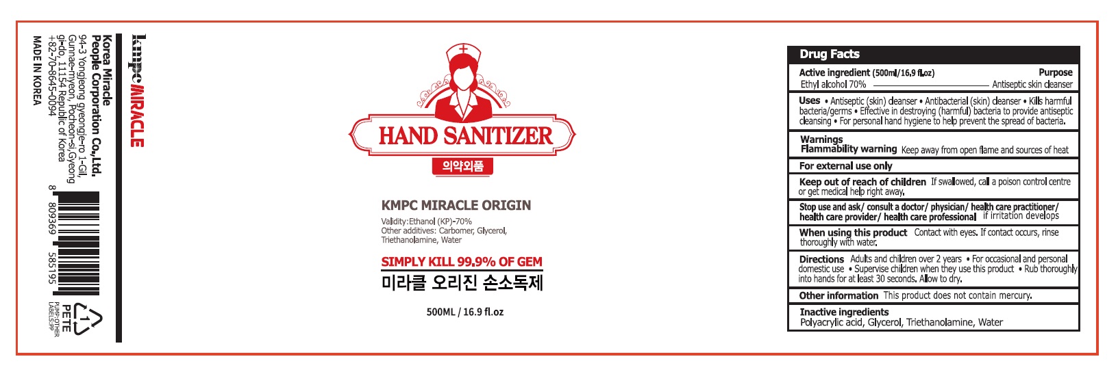 This is a description of a hand sanitizer gel named, "Kmpe IRACLE ORIGIN HAND SANITIZER GEL". It contains 70% ethanol as an active ingredient, which acts as an antiseptic skin cleanser, removing harmful bacteria from the skin. The product comes in a 500ml/16.9floz bottle and is for external use only. It has a warning to keep away from flames and heat sources, and keep it out of reach of children. If swallowed, the Poison Control Center should be contacted immediately. The product does not contain mercury but has other inactive ingredients such as Carbomer, Glycerol, Triethanolamine, and Water. It is manufactured by Korea Miradle People Corporation Co, Ltd. The product kills 99.9% germs, leaving hands feeling soft and clean.*