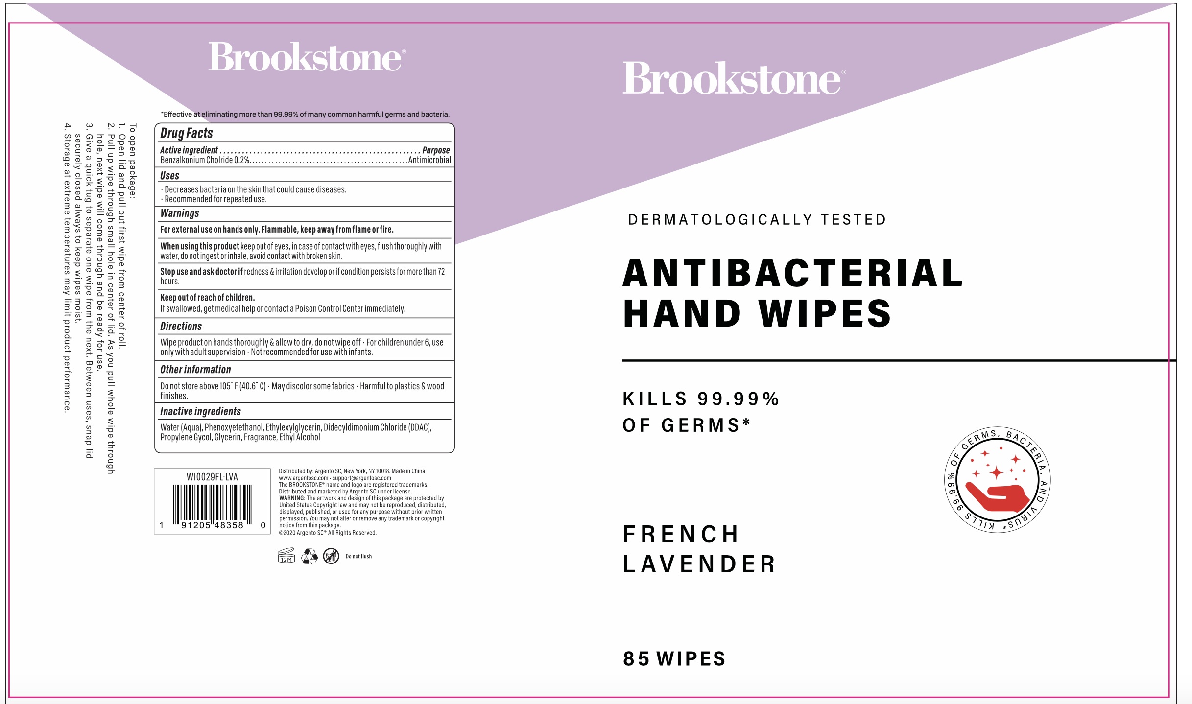 This text contains a drug fact label and description of antibacterial hand wipes. The wipes contain an active ingredient Benzalkonium Chloride 0.2% that eliminates more than 99.99% of common harmful germs and bacteria. It also includes information on its uses, warnings, directions for use, and information on its inactive ingredients. It has French Lavender fragrance and is distributed by Argento SC in New York. BROOKSTONE is a registered trademark of Argento SC.*