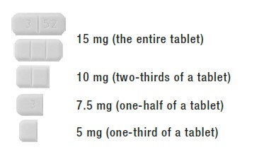 This is a list of dosage options for a medication, including the amount in milligrams for different fractions of the tablet. The options include 15 mg for the entire tablet, 10 mg for two-thirds of a tablet, 7.5 mg for half of a tablet, and 5 mg for one-third of a tablet.*