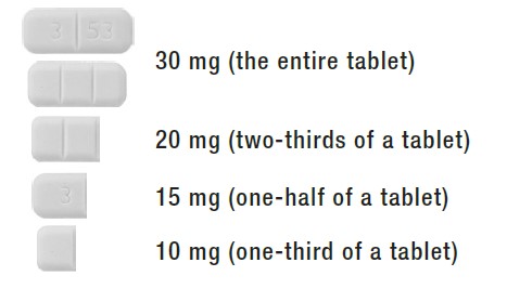 This text provides dosage information for a certain medication in terms of fractions of a tablet. It includes the dosage for the entire tablet (30 mg), two-thirds of a tablet (20 mg), one-half of a tablet (15 mg), and one-third of a tablet (10 mg).*