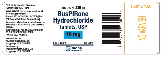 The following 13 images provide visual information about the product associated with Buspirone Hydrochloride NDC 77771-237 by Radha Pharmaceuticals, Inc., such as packaging, labeling, and the appearance of the drug itself. This resource could be helpful for medical professionals, pharmacists, and patients seeking to verify medication information and ensure they have the correct product.