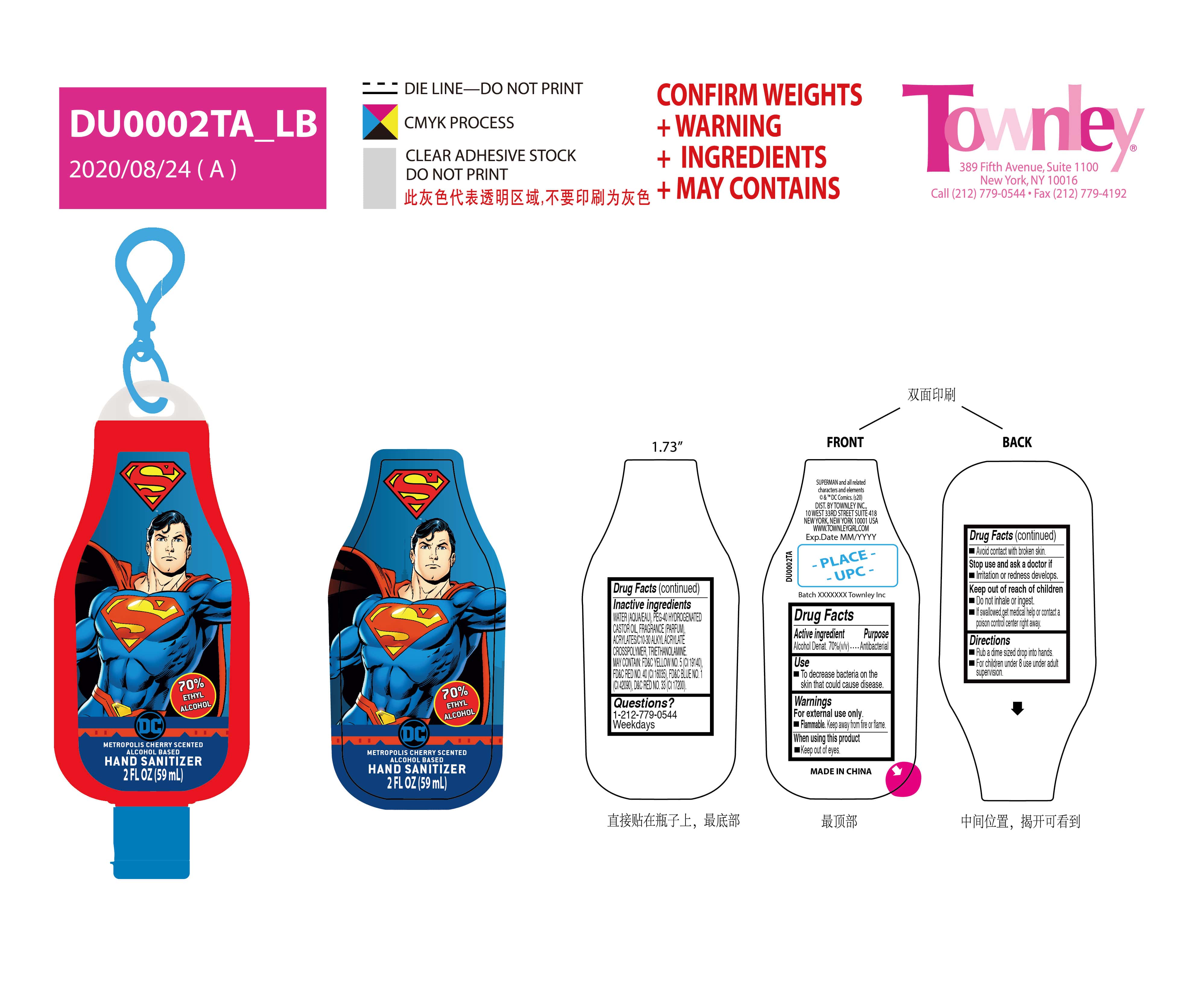 This text contains some warnings and instructions for the "Metropolis Cherry Scented Hand Sanitizer" produced by Townley Inc. It includes active and inactive ingredients, usage details, and warnings for the customers to avoid any potential skin irritation or redness. It also provides some contact information for the customers who may have questions about the product.*
