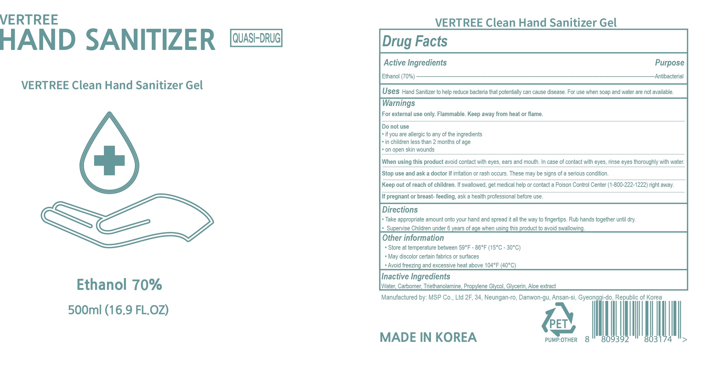 Vertree Clean Hand Sanitizer Gel is an antibacterial 500 ml gel that contains 70% ethanol, intended for use when soap and water are not available. The gel should be applied to the hand and spread across until it is dry. It is not suitable for children under two months or on open skin wounds, and care should be taken to avoid contact with eyes, ears, and mouth. The product may cause irritation or a rash, but if swallowed, medical help should be sought at once. The manufacturer is based in Ansan-si, Gyeoniii-do, Republic of Korea.*