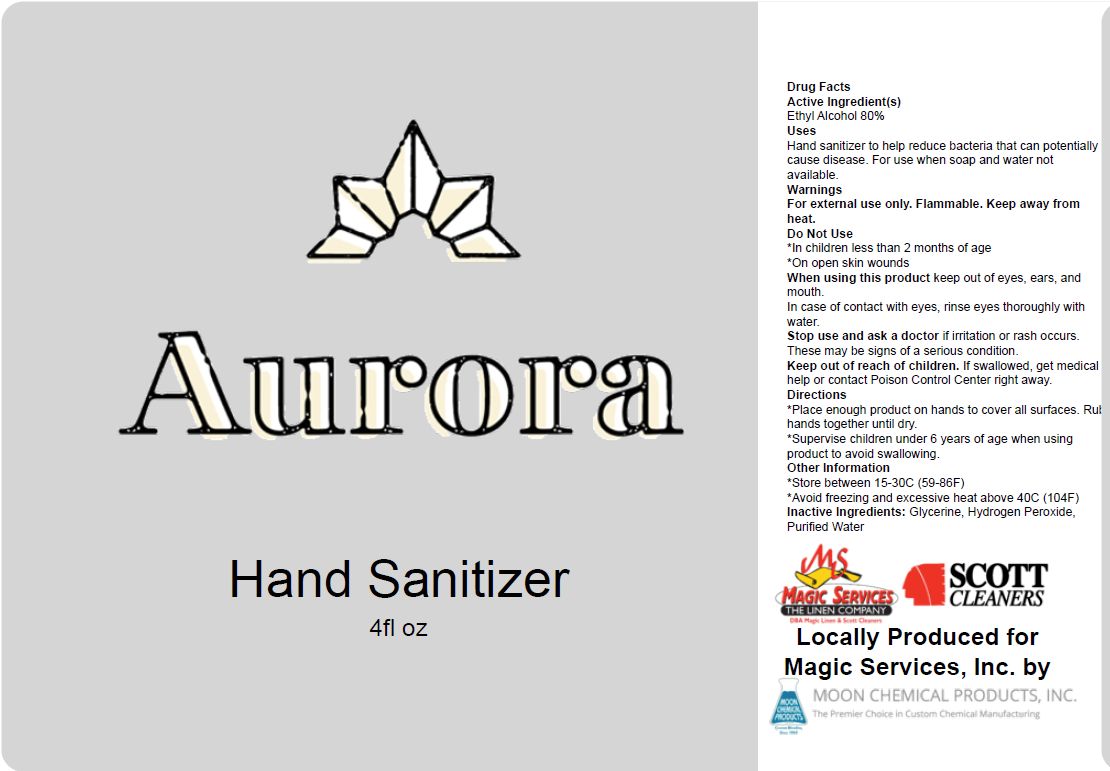 This is a drug facts label for a hand sanitizer containing 80% Ethyl Alcohol. It is intended for external use only to reduce bacteria that can potentially cause disease. The label includes warnings and directions for use, including avoiding contact with eyes, keeping out of reach of children, and seeking medical attention if irritation or rash occurs. The inactive ingredients include glycerine, hydrogen peroxide, and purified water. The hand sanitizer was produced by Magic Services, Inc. and is sold locally in a 4 fl oz. bottle.*