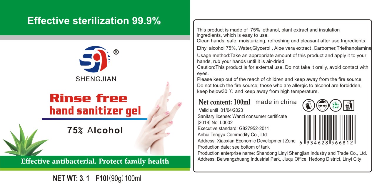 This is a hand sanitizer gel from the brand Shengjian. The product contains 75% ethanol, plant extracts, and insulation ingredients for effective sterilization. It is rinse-free and moisturizes the hands while leaving a refreshing and pleasant feeling after use. The product has a net content of 100ml and a production date printed on the bottom of the tank. The user should apply an appropriate amount of the gel and rub it onto their hands until air-dried. This product is for external use only, and caution should be taken to avoid contact with eyes or oral consumption. Allergic individuals are recommended not to use the product, and it should be kept away from children and fire sources. The executive standard is G827952-2011, and the production enterprise name is Shandong Linyi Shengjian Industry and Trade Co., Ltd.*