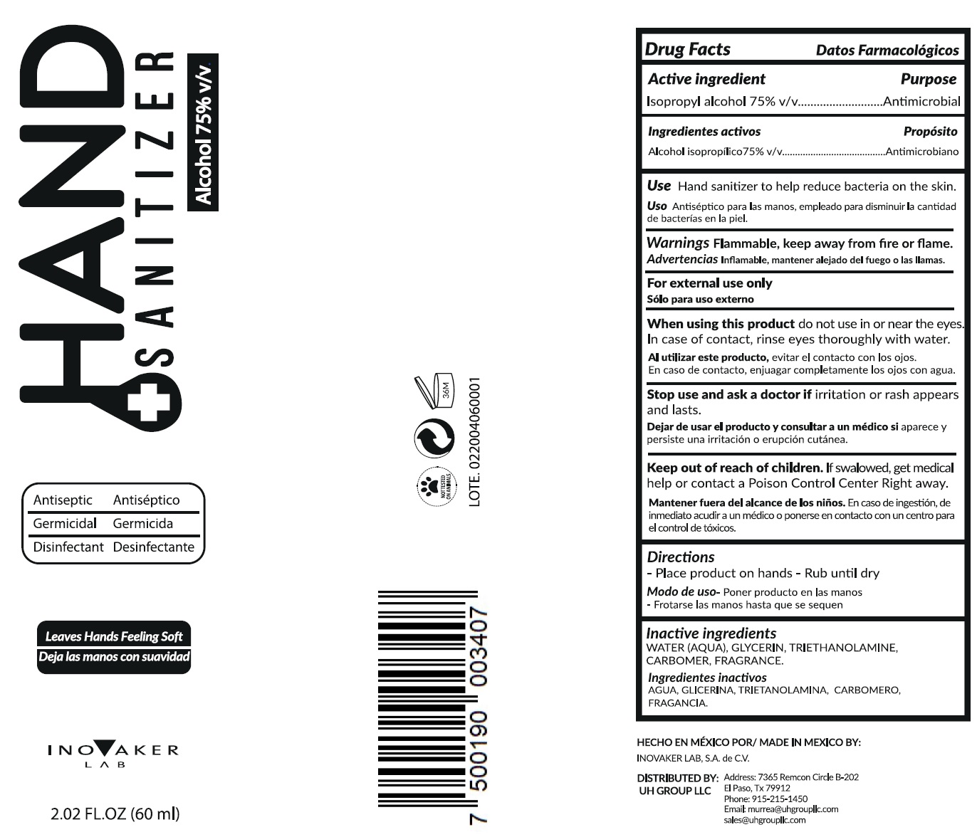 This is a drug fact label for a hand sanitizer produced by Inovaker Lab in Mexico. The hand sanitizer contains 75% alcohol and helps reduce bacteria on the skin. It should only be used externally and kept away from children. To use, apply the product to hands and rub until dry. The inactive ingredients include water, glycerin, triethanolamine, carbomer, and fragrance. The label also provides warnings to keep the product away from fire or flame and avoid contact with eyes.*