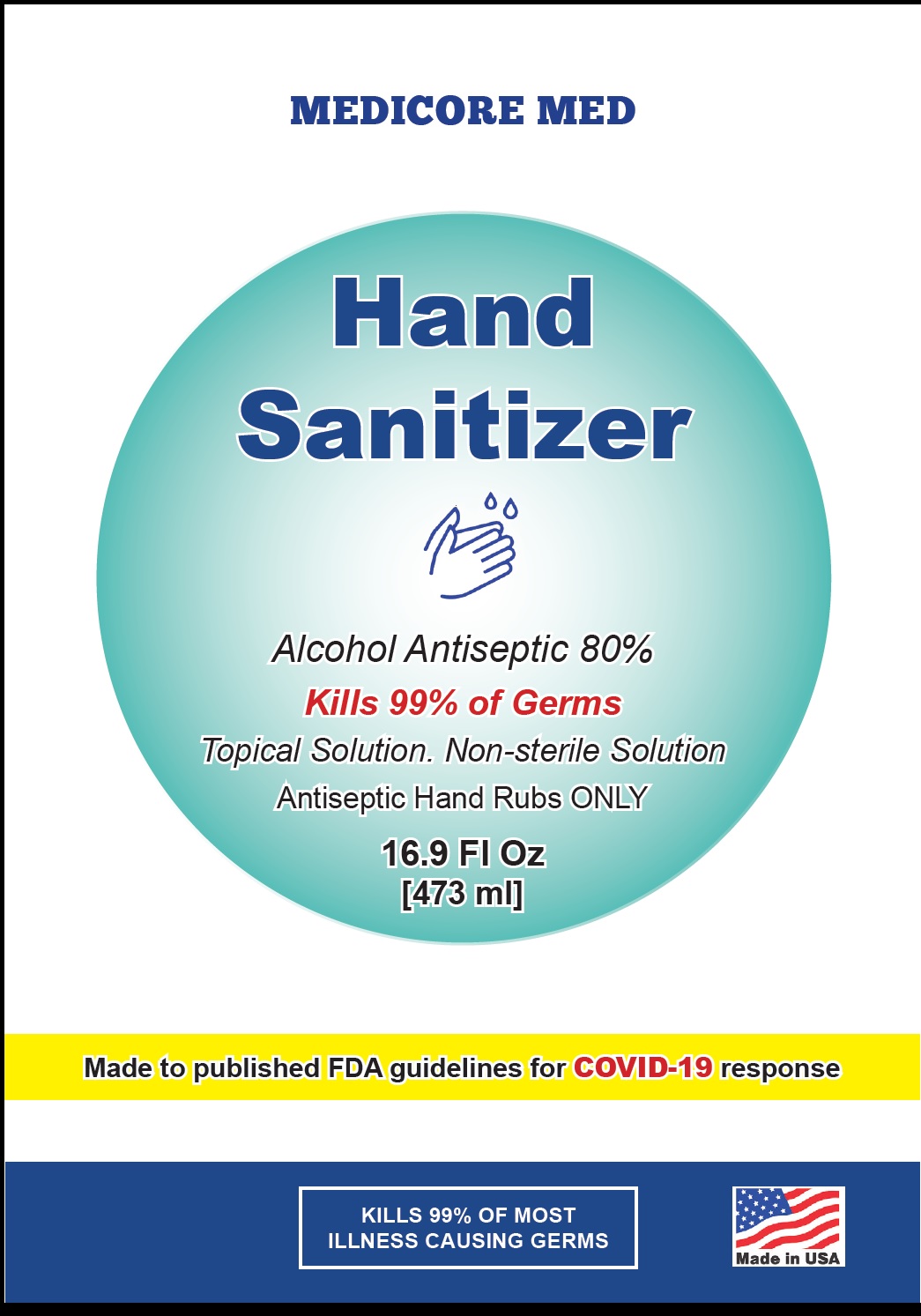 This is a description of a hand sanitizer called "MEDICORE MED". It is an alcohol antiseptic solution with 80% volume of denatured alcohol. It is a non-sterile and topical solution made to comply with FDA guidelines for COVID-19 response. It is intended for use as a hand sanitizer to help reduce bacteria when soap and water are not available. It kills 99% of germs and viruses and comes in a one-quart bottle. The product contains warnings not to use on children less than 2 months of age, on open skin wounds, and not to get into eyes, ears, or mouth. Inactive ingredients include glycerin, hydrogen peroxide, and purified water. The product is manufactured in the USA by Medicore Med LLC located in Huntingdon Valley, Pennsylvania.*