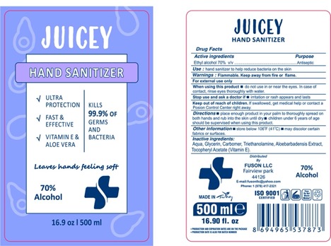 The following image provide visual information about the product associated with Juicey Hand Sanitizer NDC 78141-900 by Fuson Llc, such as packaging, labeling, and the appearance of the drug itself. This resource could be helpful for medical professionals, pharmacists, and patients seeking to verify medication information and ensure they have the correct product.