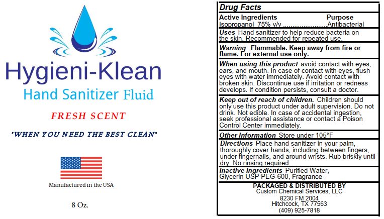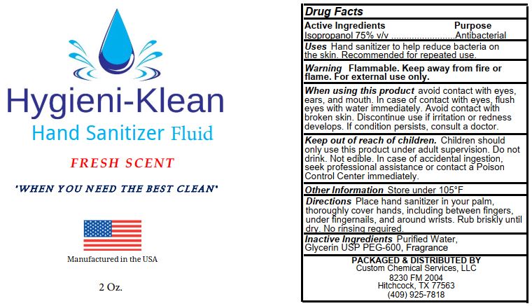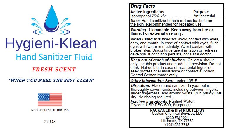 Hygieni-Klean Hand Sanitizer Fluid is an antibacterial solution with isopropanol as the main ingredient, designed to reduce bacteria on the skin. It is recommended for repeated usage and comes in a fresh scent. The product is manufactured in the USA and has warnings against its flammability, directing users to avoid contact with eyes, ears, mouth, and broken skin. The sanitizer must be kept away from children and ingested. The inactive ingredients include purified water, glycerin USP PEG-600, and fragrance. The product must be stored under 105°F and applied by thorough coverage of the hands followed by brisk rubbing until dry. The product is distributed by Custom Chemical Services, LLC, in Hitchcock, X, with the phone number (409) 9257818.*