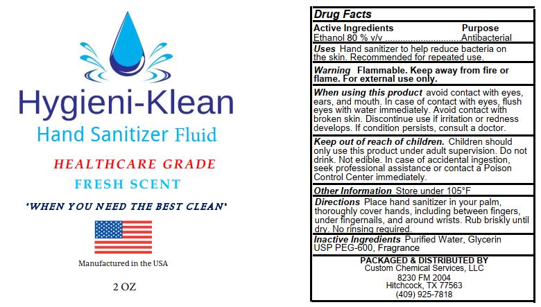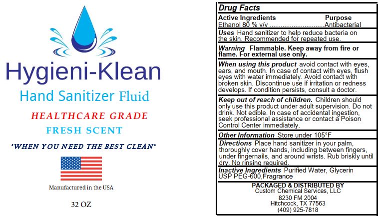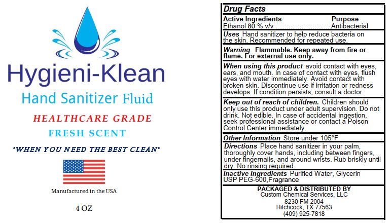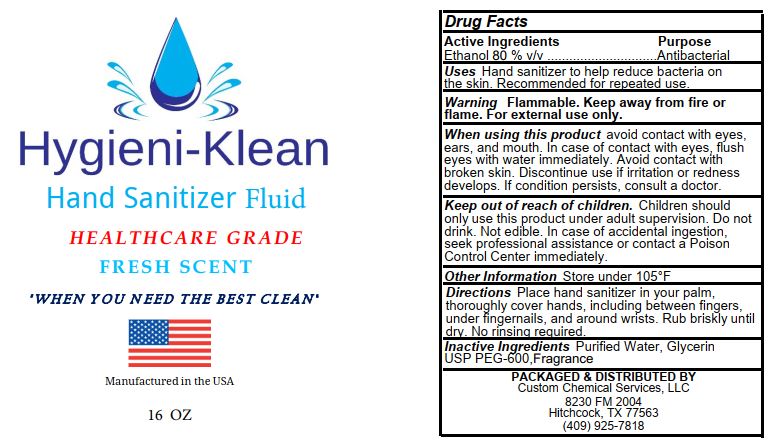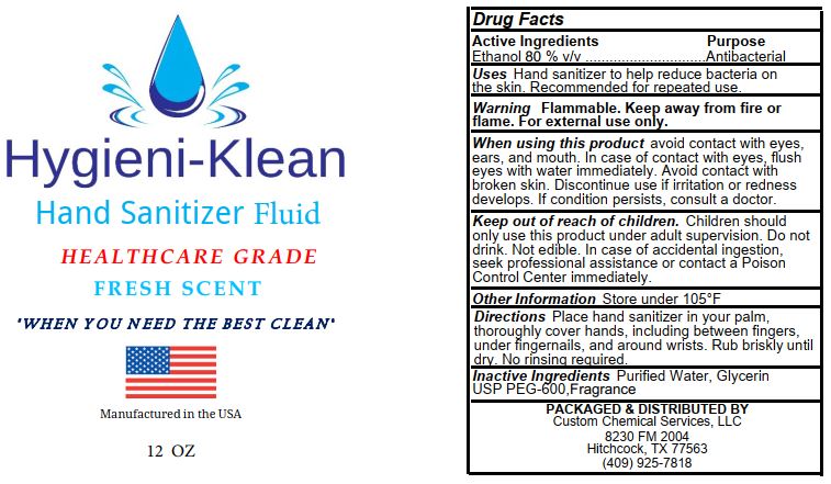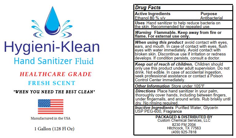 Hygieni-Klean Hand Sanitizer Fluid is a healthcare grade hand sanitizer that helps reduce bacteria on the skin. It contains 80% ethanol and has a fresh scent. It is recommended for repeated use and should be kept away from fire or flame. When using this product, avoid contact with eyes, ears, and mouth. If irritation or redness develops, discontinue use and consult a doctor. Children should only use this product under adult supervision and should not drink it as it is not edible. The inactive ingredients are purified water, glycerin, and fragrance. It is packaged and distributed by Custom Chemical Services, LLC, and kept under a temperature of 105°F. Directions for use involve thoroughly covering hands with the product and rubbing until dry, no rinsing is required.*