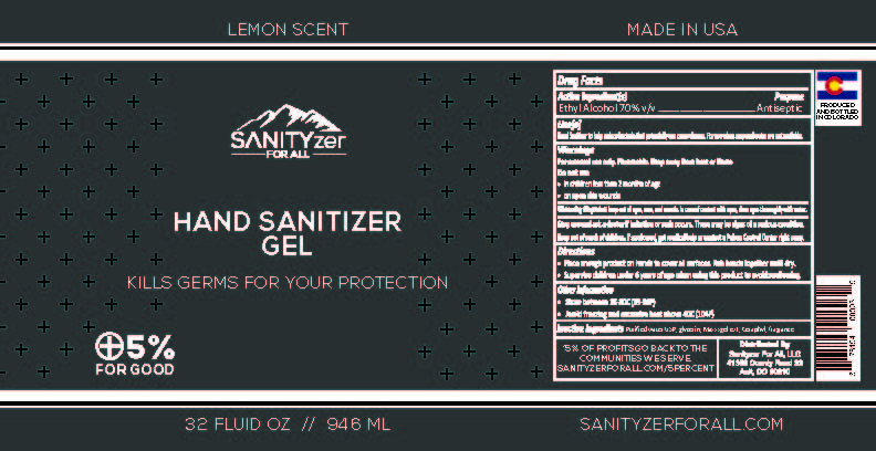 This is a Lemon Scented Hand Sanitizer Gel that effectively kills germs to protect you from infections. The product is made in the USA and contains 5% of P5% FORG00D formula. The package has a size of 85 fluid ounces or 251 milliliters, and the brand's website is sanityzerforall.com.*