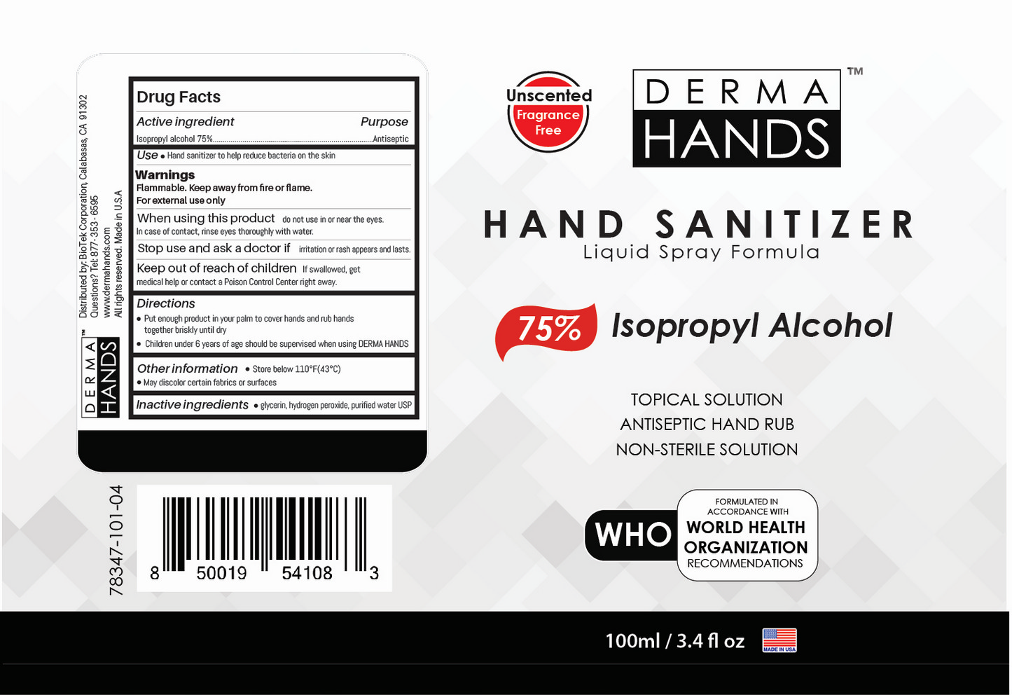 This is a drug facts sheet for DERMA HANDS hand sanitizer which contains 75% Isopropyl alcohol as an active ingredient. It is an antiseptic hand sanitizer that can help reduce bacteria on the skin. The product is flammable and should be kept away from fire or flames. DERMA HANDS should not be used near the eyes and should be kept out of reach of children. The product should be put in the palm and rubbed briskly until dry. The inactive ingredients include glycerin, hydrogen peroxide, and purified water USP. This liquid spray formula is an all-purpose hand sanitizer and can also be used to disinfect and sanitize surfaces. It is storeable below 110°F and may discolor certain fabrics or surfaces. The product is distributed by BioTek Corporation, made in the USA, and available for inquiries at 877- 353 - 6595 or at www.dermahands.com.*