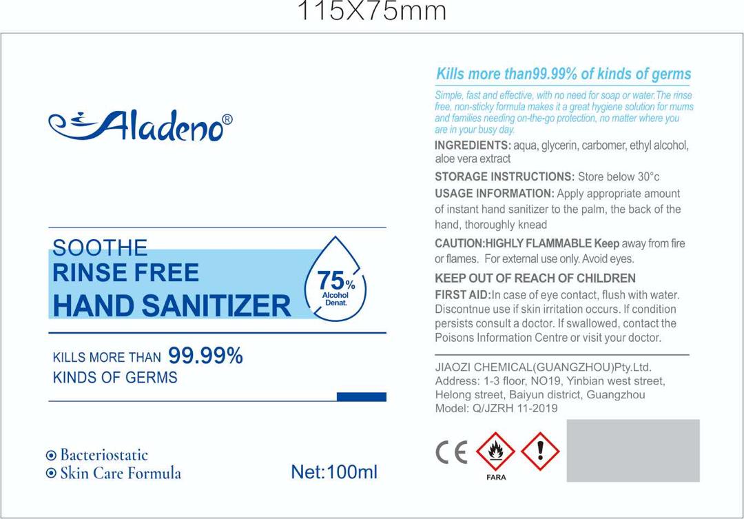 Aladenc® Hand Sanitizer is a rinse-free solution that kills more than 99.99% of germs. It contains aqua, glycerin, carbomer, ethyl alcohol, and aloe vera extract. It is highly flammable and should be kept away from fire or flames. The hand sanitizer is for external use only and should be kept out of reach of children. In case of skin irritation, discontinue use and consult a doctor. In case of eye contact, flush with water. It comes in a 100ml bottle and should be stored below 30°C. The product is manufactured by JIAOZI CHEMICAL (GUANGZHOU) Pty.Ltd.*