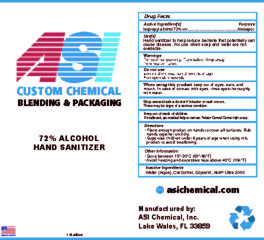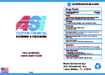 This is a description of a company called ASI Chemical, Inc. which offers custom chemical blending and packaging services. They appear to manufacture a hand sanitizer with 72% alcohol content. There is a website provided asichemical.com. They are based in Lake Wales, FL 33859.*