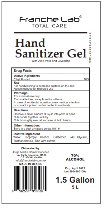 This is a description of a hand sanitizer gel labelled Franche Lab' Total Care. It contains Ethyl Alcohol 10 and Aloe Vera to decrease bacteria on the skin. It is recommended for repeated use. It includes a warning that it's for external use only and is flammable. In case of accidental ingestion, one should seek medical attention or contact a poison control center immediately. The user should apply a small amount of the liquid into the palm of the hand and rub hands together until dry. It is advised to store it in a cool and dry place. The inactive ingredients used in the product include water, Isopropyl alcohol, Carbomer 940, Glycerin, Triethanolamine and Aloe Vera extract. The product is made in Mexico and available in 33.8fl oz, 1L and 750mL bottles.*