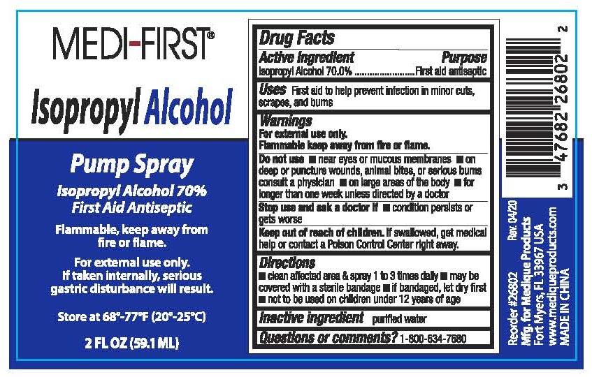 MEDI-FIRST Isopropyl Alcohol is a first aid antiseptic that comes in a handy pump spray bottle. It contains 70% isopropyl alcohol and is intended for external use only. The product is flammable and should be kept away from fire or flame. It is important not to use the product near eyes or mucous membranes, on deep or puncture wounds, animal bites, or serious burns, and not to use it on large areas of the body for longer than a week, unless directed by a doctor. The product should also be kept out of reach of children and should not be used on children under 12 years of age. If swallowed, medical help should be sought immediately.*