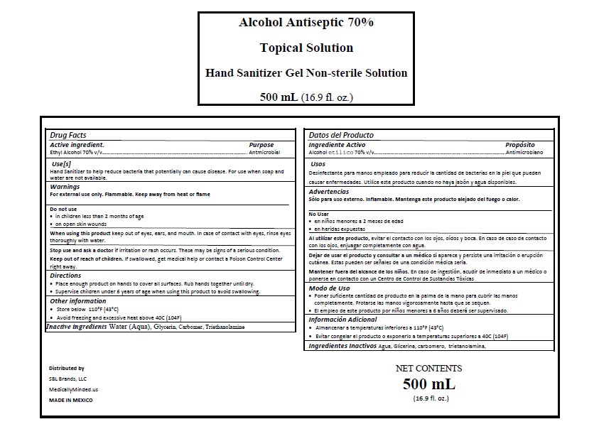 This is a description of a 70% alcohol antiseptic hand sanitizer gel in a 500 mL (16.9 fl oz) solution bottle. However, some parts of the text are difficult to decipher due to errors.*