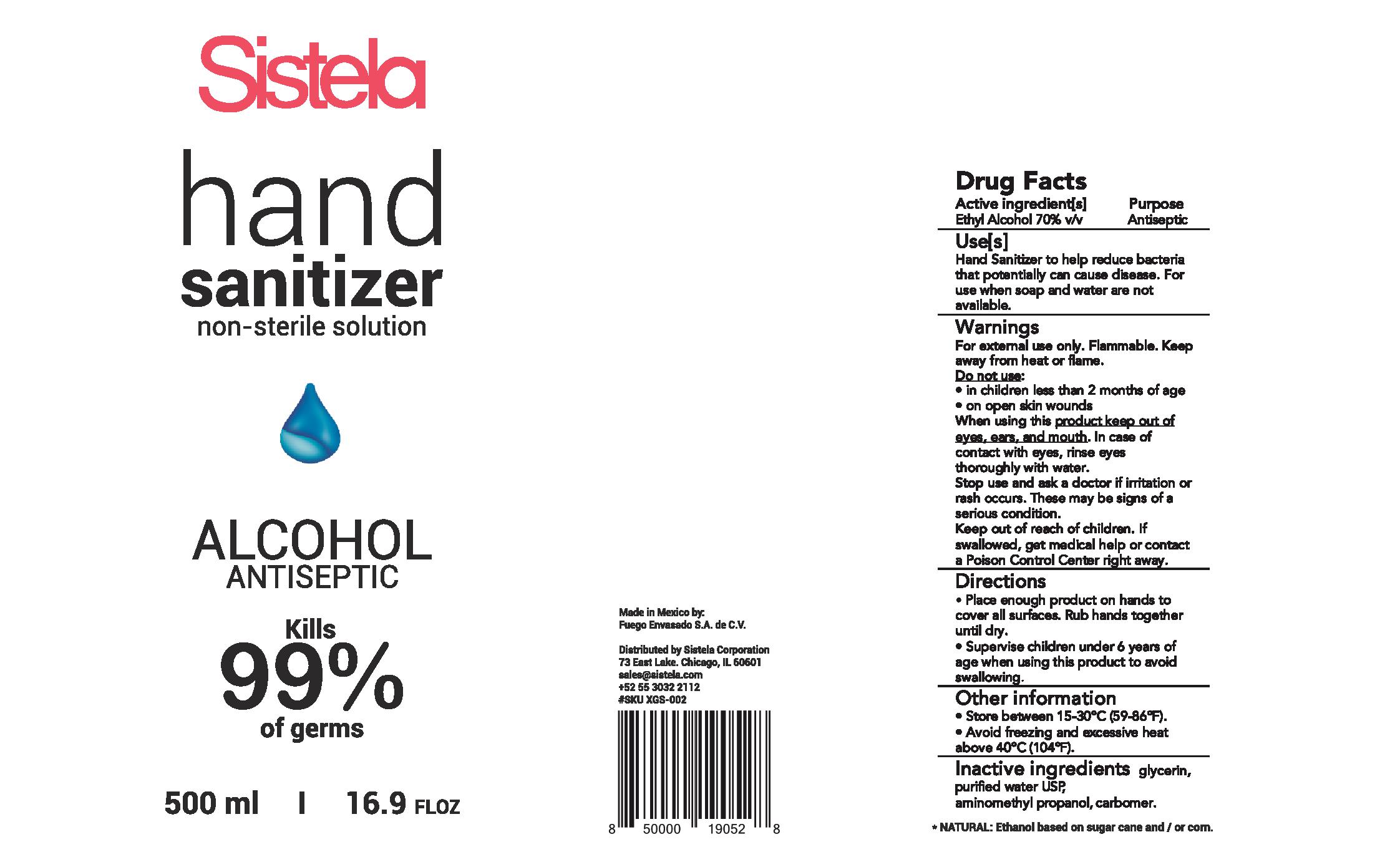 This is a hand sanitizer non-sterile solution produced in Mexico. It contains 70% ethyl alcohol, working as an antiseptic that kills 9% of germs. The product comes in a 500ml bottle and is distributed by Sistela Corporation in Chicago, Illinois. The solution is sold under #8KU XG8-002 and is not recommended for children under two months of age or for usage on open skin wounds. For external use only, one has to keep the sanitizer away from heat or flame, and avoid contact with eyes, ears, and mouth. If irritation, rash, or ingestion appears, please seek medical help or contact a Poison Control Center.*