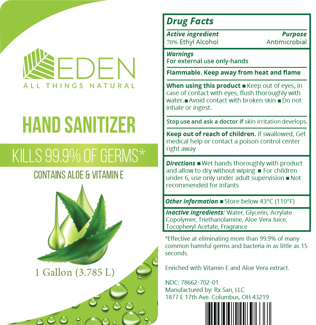 This is a description of EDEN hand sanitizer containing 70% ethyl alcohol for use as an antimicrobial. Other ingredients include aloe vera juice and tocopheryl acetate. The product comes in a 1-gallon container and is effective at eliminating more than 99.9% of harmful germs and bacteria within 15 seconds of use. It is also enriched with Vitamin E. The product contains warnings like it should be kept out of reach of children, should not be ingested, and should be only used for external use only. It also recommends seeing a doctor if skin irritation occurs. Finally, it is manufactured by Rx San, LLC and has an NDC: 78662-702-01.*