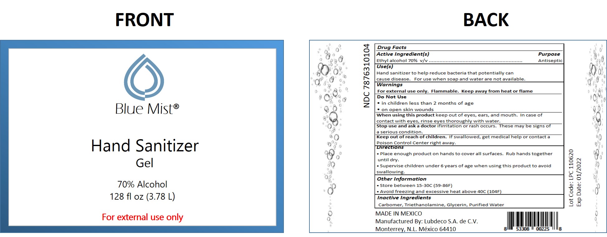 Blue Mist Hand Sanitizer Gel is a 70% alcohol-based hand sanitizer for external use only. It helps to reduce bacteria that can potentially cause disease and is recommended for use when soap and water are not available. The product comes in a 33.8floz bottle (1L) and includes directions for use, warnings, and information about inactive ingredients. This product is manufactured by Lubdeco S.A. de CV in Monterrey, N.L. México, and the lot code is LPC 110620 with an expiration date of 01/2022.*