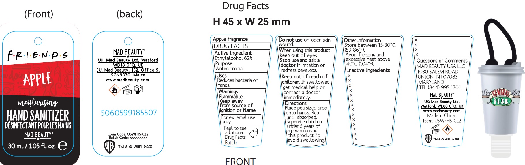 This is a 30ml hand sanitizer with a 62% ethyl alcohol concentration to reduce bacteria on hands. It has an apple fragrance and includes drug facts on the label. The product is made by Mad Beauty and the batch code is Xxxxx000xx. The item code is USWFHS-C12 and the UPC is 5060599185507. The label warns not to use on open skin, to avoid freezing or excessive heat, and to consult a doctor if irritation or redness develops. Made in China.*