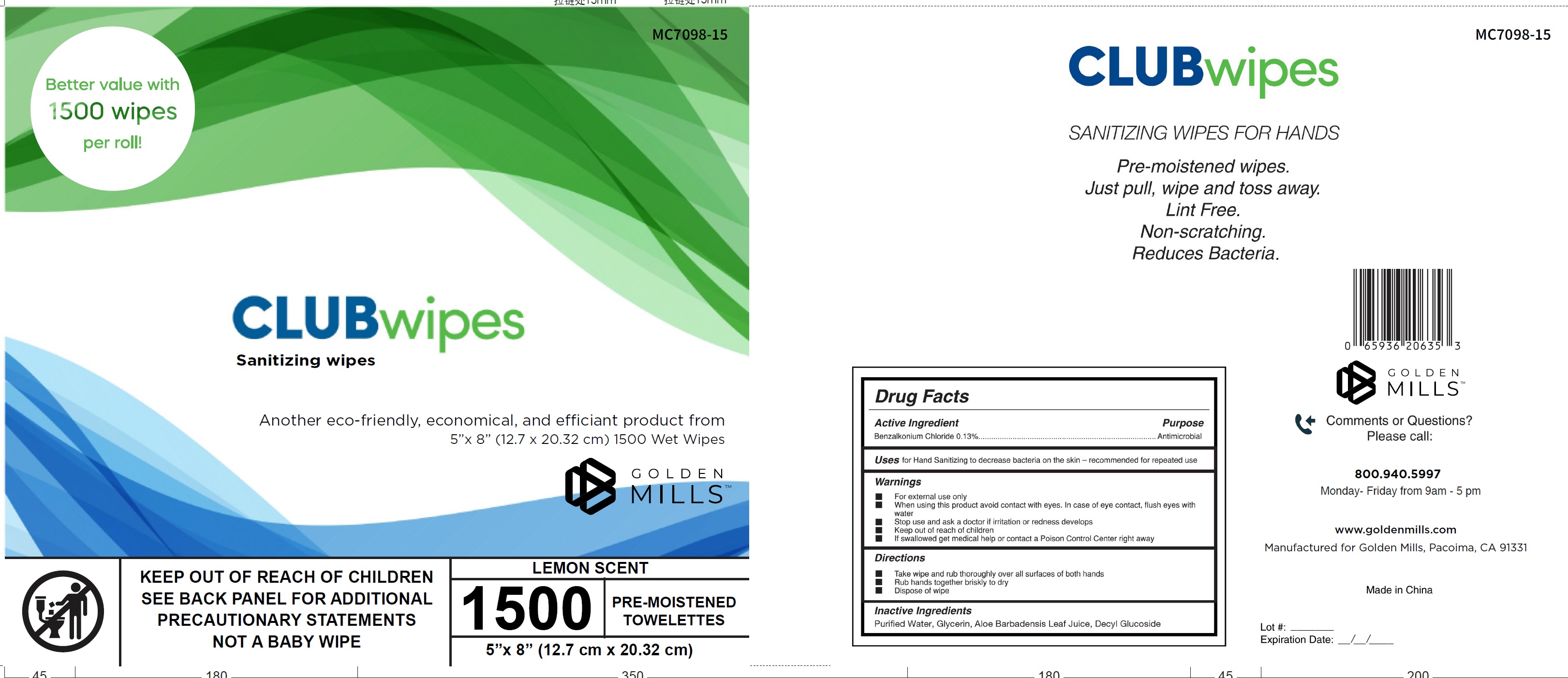 "CLUBwipes SANITIZING WIPES FOR HANDS - Pre-moistened lint-free wipes designed for easy use. These 5x8" wipes are suitable for hand sanitizing, with active ingredient Benzalkonium Chloride 0.13%. Recommended for reducing bacteria on the skin with a lemon-scented formula. External use only, avoid contact with eyes. Manufactured by Golden Mills in Pacoima, CA, these wipes are convenient for quick and efficient hand cleaning on the go. Expiration date and detailed instructions provided on the packaging."*