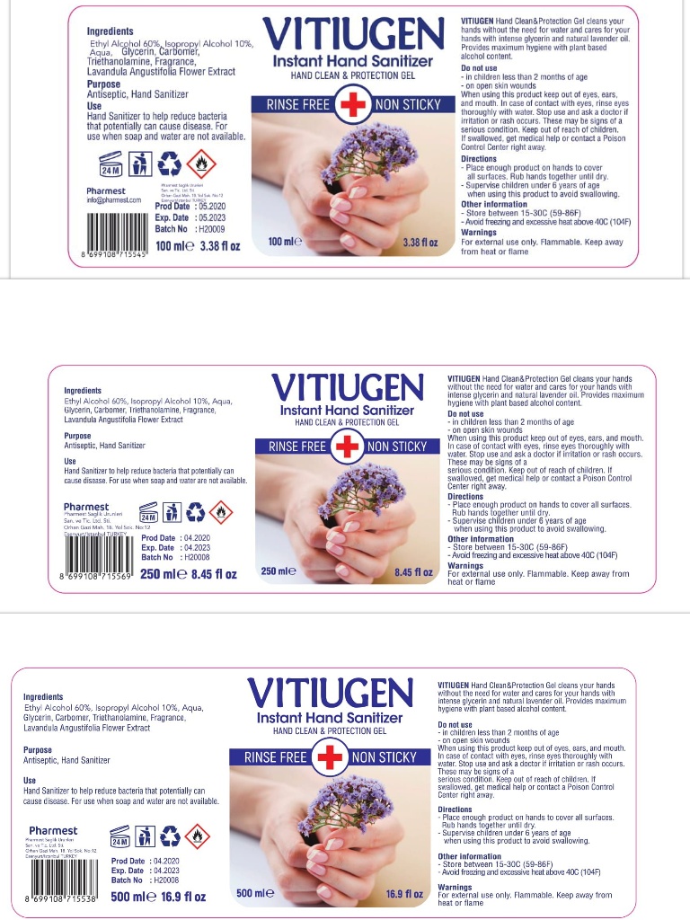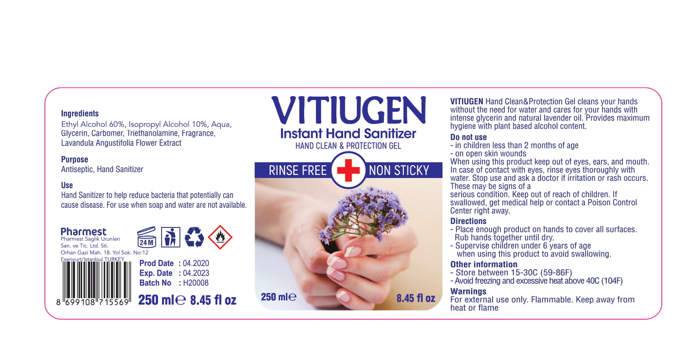 This is a hand sanitizer product that contains Ethyl Alcohol, Isopropyl Alcohol, Glycerin, Carbomer, Triethanolamine, Fragrance, and Lavandula Angustifolia Flower Extract. It is intended to help reduce bacteria on hands to prevent disease. The product is produced by the company Pharmest Sagik Urunleri and comes in a 250 ml (8.45 fl oz) bottle. The hand sanitizer is marketed as VITIUGEN Instant Hand Sanitizer and is non-sticky. It is made with plant-based alcohol and cares for hands with glycerin and natural lavender oil. The product should not be used on children under 2 months of age or on open skin wounds. It is also flammable and should be kept away from heat or flame.*