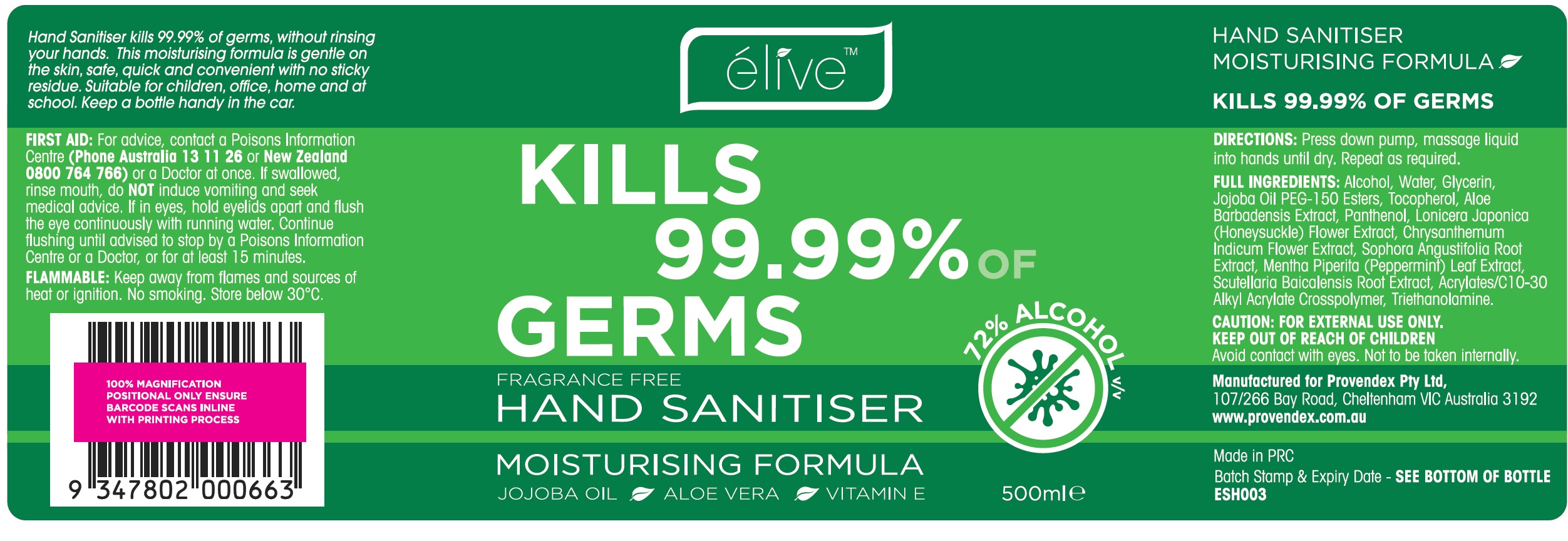 This is a description of a hand sanitizer with a moisturizing formula that can kill 99.99% of germs without rinsing. It is safe and quick to use, and does not leave a sticky residue. The directions indicate that users must press down the pump and massage the liquid into their hands until dry. The hand sanitizer contains alcohol, water, glycerin, jojoba oil PEG-150 esters, tocopherol, aloe barbadensis extract, panthenol, Lonicera japonica flower extract, Chrysanthemum indicum flower extract, Sophora angustifolia root extract, Mentha piperita leaf extract, Scutellaria baicalensis root extract, Acrylates/C10-30 alkyl acrylate crosspolymer, and Triethanolamine. The product is manufactured in PRC and is distributed by Provendex Pty Ltd. A caution is being provided, and it is recommended to keep it away from the reach of children, and avoid contact with eyes. The text includes first aid instructions and suggests that one should seek medical advice if swallowed or in contact with eyes. Batch Stamp & Expiry Date is provided at the bottom of the bottle.*