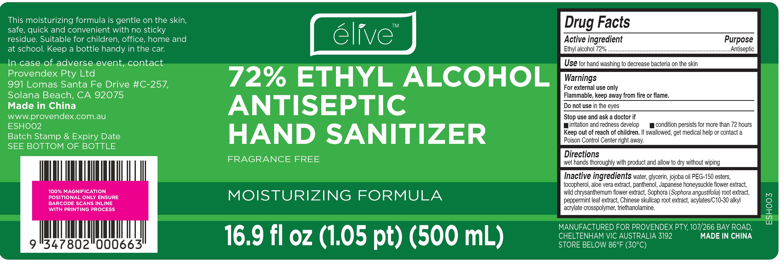 The following 4 images provide visual information about the product associated with Elive Hand Sanitizer NDC 79123-000 by Provendex Pty Ltd, such as packaging, labeling, and the appearance of the drug itself. This resource could be helpful for medical professionals, pharmacists, and patients seeking to verify medication information and ensure they have the correct product.