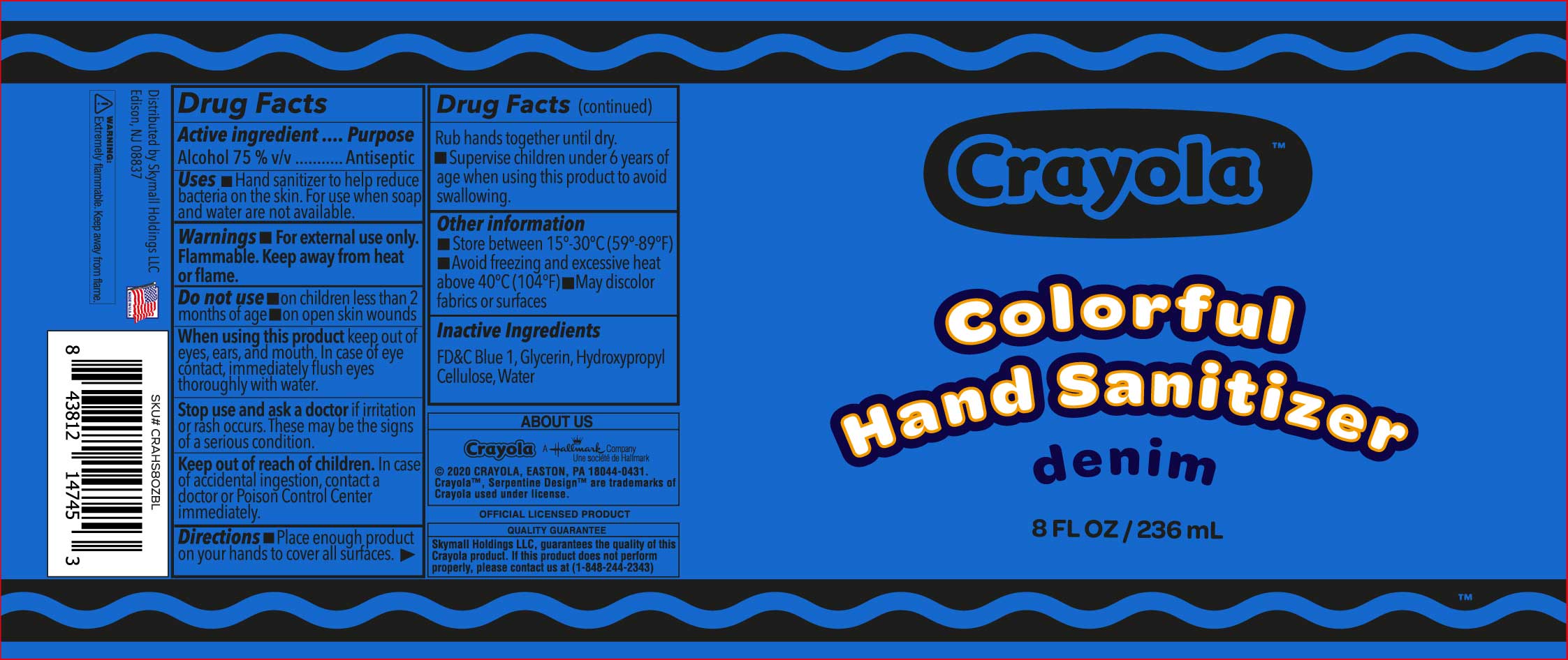 This is a hand sanitizer produced by Crayola, which has 75% alcohol as the active ingredient to help reduce bacteria on the skin. It is used when soap and water are not available, and can be used on all skin surfaces. The product comes with warnings, such as keeping it away from heat or flame, and not using it on children under 2 months of age, or on open skin wounds. In case of accidental ingestion, Poison Control Center must be contacted immediately. The inactive ingredients include FD&C Blue 1, FD&C Red 40, FD&C Yellow 5, glycerin, hydroxypropyl cellulose, and water. It should be stored between 59°F-89°F and away from excessive heat above 104°F. The quality of the product is guaranteed by SkyMall LLC.*