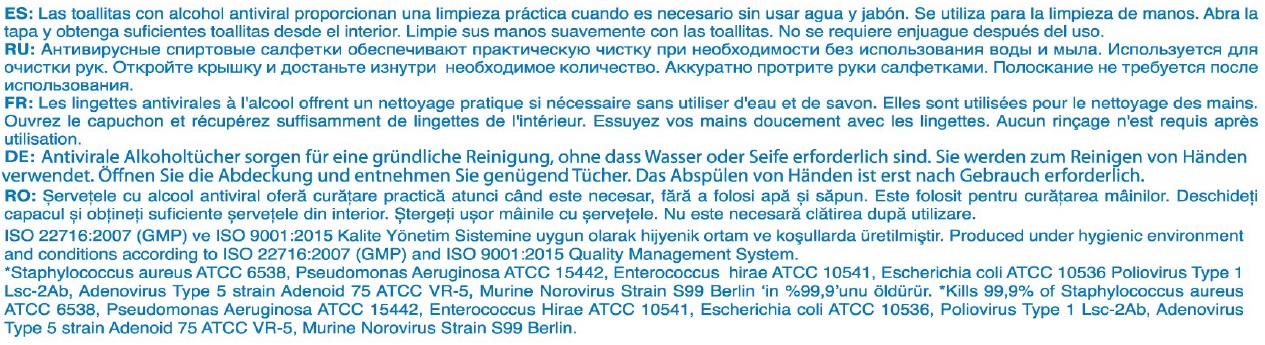 These are alcohol-based antiviral wipes that provide convenient cleaning without water and soap. They are used for hand hygiene and can be retrieved from the inside by opening the cap. The wipes can be used to clean hands gently without rinse after use. The product was produced in hygienic conditions according to ISO 22716:2007 (GMP) and ISO 9001:2015 Quality Management System. These wipes are effective against various viruses and bacteria, including Staphylococcus aureus, Pseudomonas Aeruginosa, and Escherichia coli.*