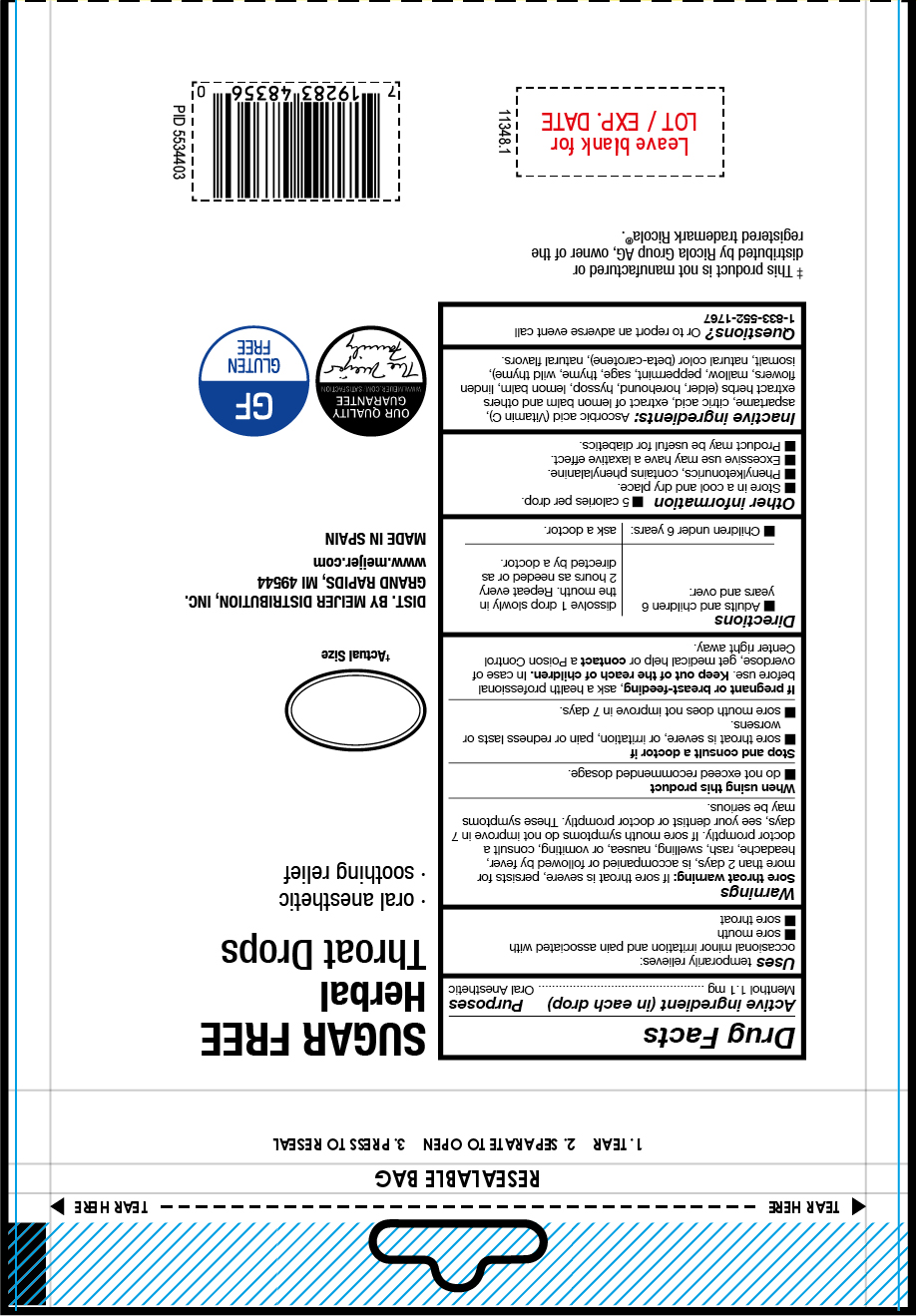 This is the packaging label for Meijer Sugar Free Herbal Throat Drops. The drops are lemon-flavored with a hint of mint and contain a cooling effect to soothe sore throats. The package is resealable for convenience.*