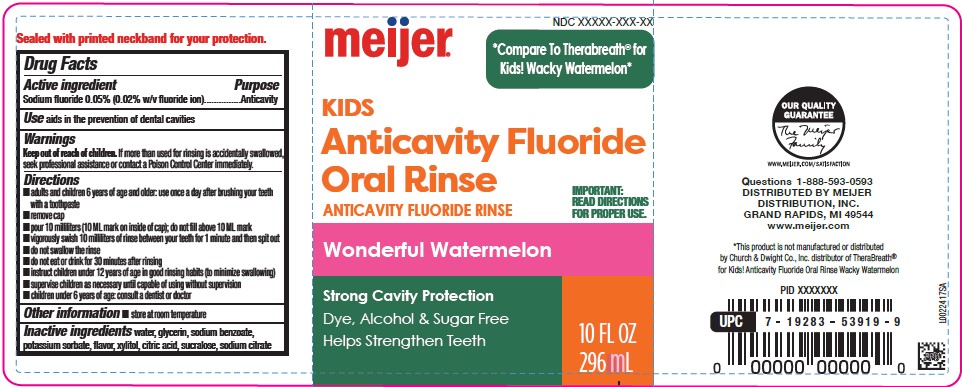 This text provides information about a watermelon-flavored kids' anticavity fluoride rinse. The product claims to help prevent dental cavities and offers strong cavity protection, while being dye, alcohol, and sugar-free. For further questions or inquiries, customers are instructed to contact the distributor Meer Distribution, Inc. The product comes in a 296 mL size.*