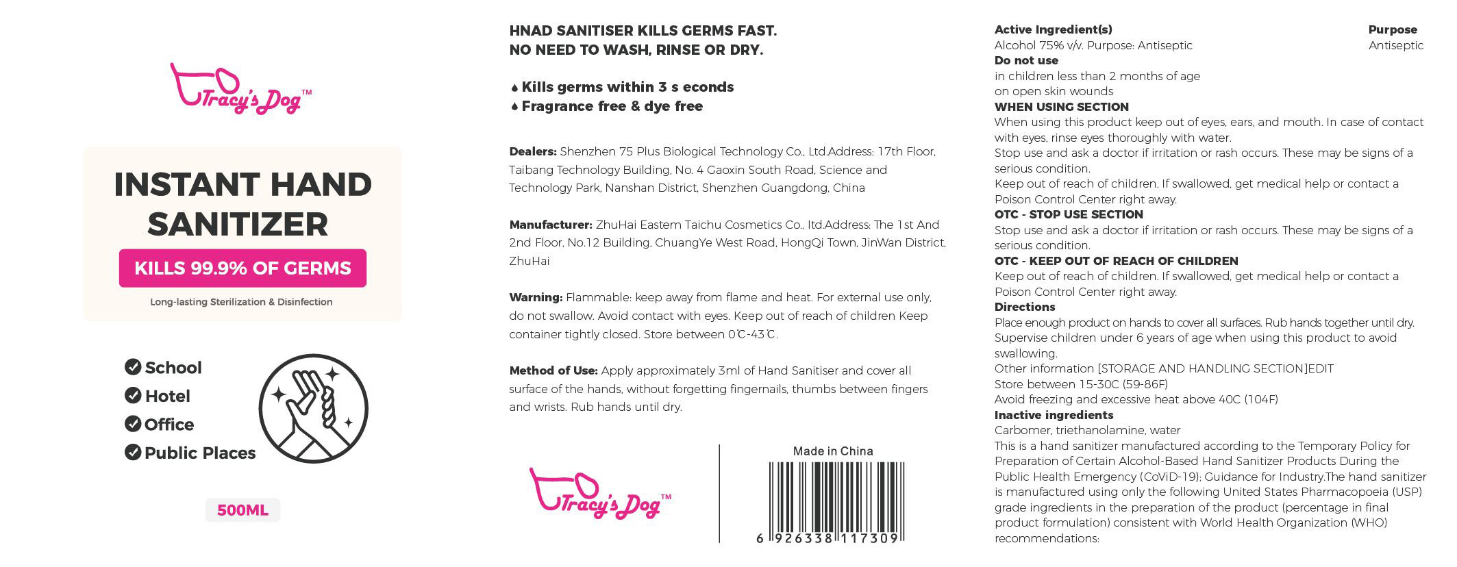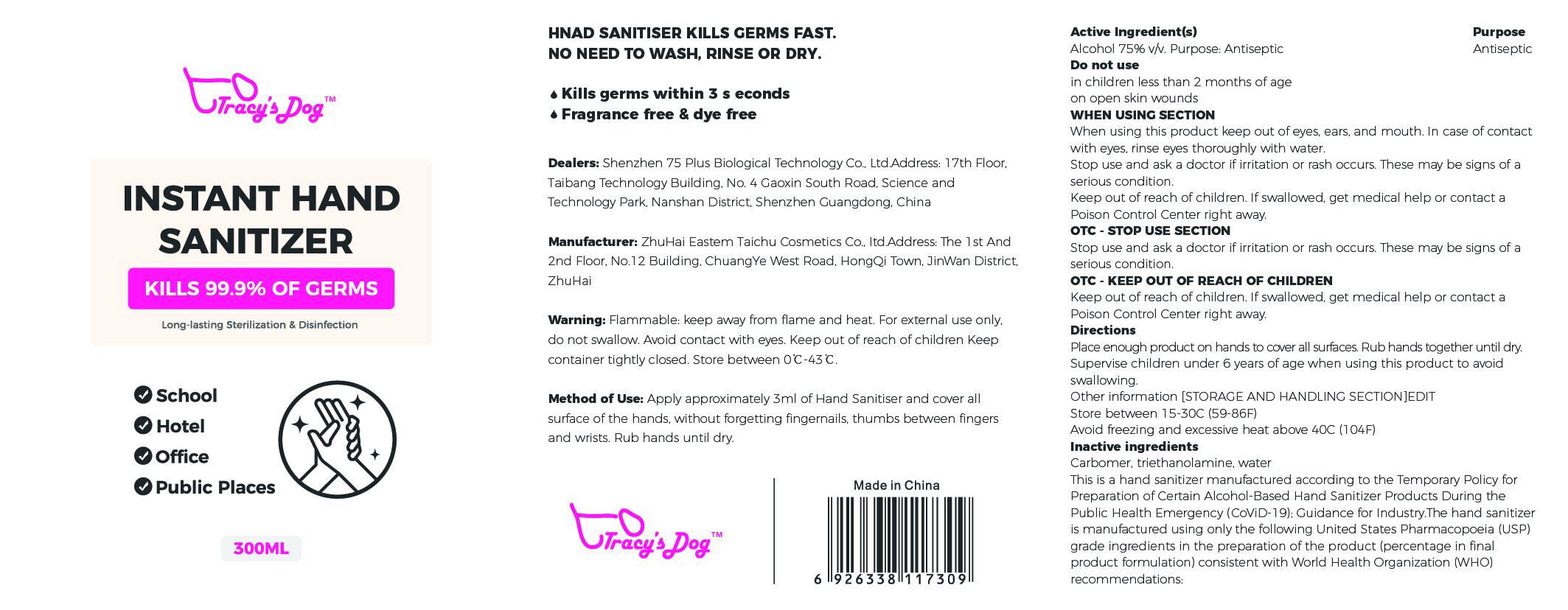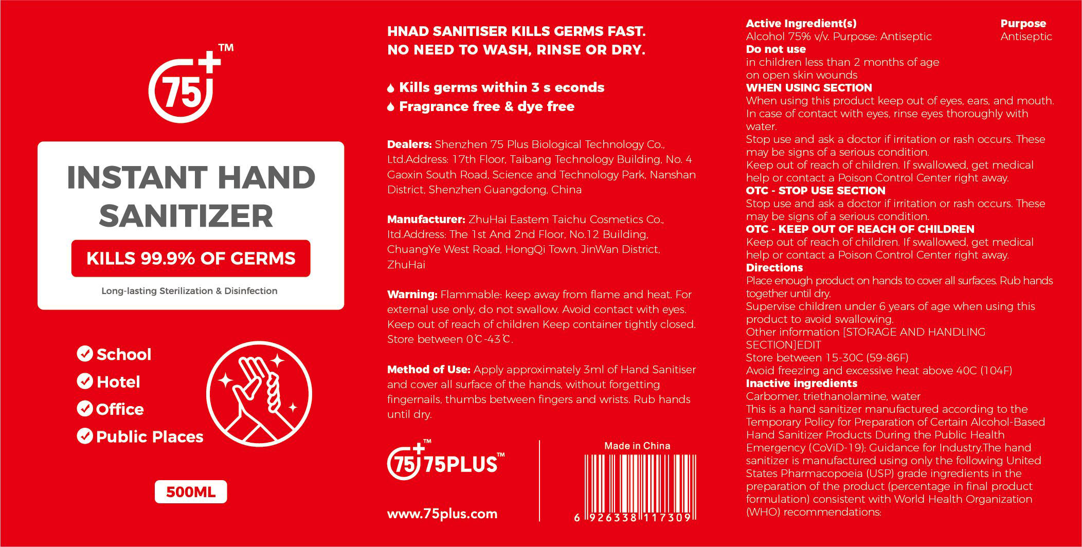 This is a hand sanitizer that kills 99.9% of germs within 3 seconds. It provides long-lasting sterilization and disinfection making it useful for schools, hotels, and public places. The sanitizer is fragrance-free, dye-free, and requires no washing, rinsing, or drying. However, it is flammable and should be kept away from flame and heat. The sanitizer is manufactured by ZhuHai Eastern Taichu Cosmetics Co. and it contains 75% v/v alcohol, which is an antiseptic. It should be kept out of the reach of children and should not be used near the eyes, ears, or mouth. If swallowed, medical help should be sought immediately. The sanitizer is made in China and contains inactive ingredients such as carbomer, triethanolamine, and water. It is manufactured following the World Health Organization's (WHO) recommendations for Hand Sanitizer Products During the Public Health emergency.*